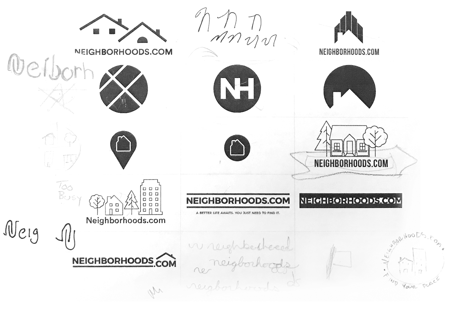 Digital sketches of logo variations to capture the idea of “what do people think of as a neighborhood?”